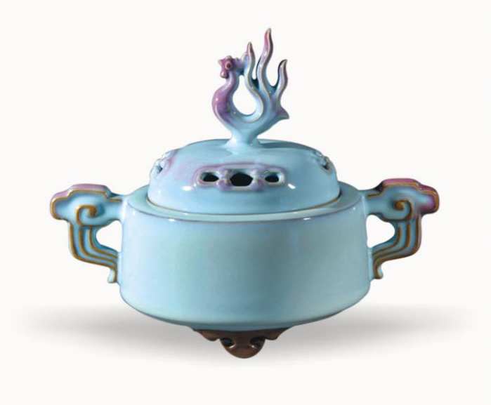 造型为一香炉,炉盖钮为一只雄鸡昂首挺立,炉盖上四个接空如意纹饰。炉体两侧装饰如意祥云耳饰。如意精美,祥云飘逸,顾盼生姿,灵动活泼。鸡通吉