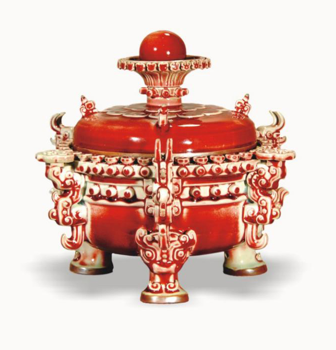 鼎,自古以来被视为国家重器,象征稳定、安宁与和平,代表发展、昌盛、繁荣,体现了中华文明的伟大品格与灿烂文化。它,就是由中国工艺美术馆收藏、中国工艺美术大师孔相卿为新中国成立60周年创作的钧瓷《鼎盛华夏》。